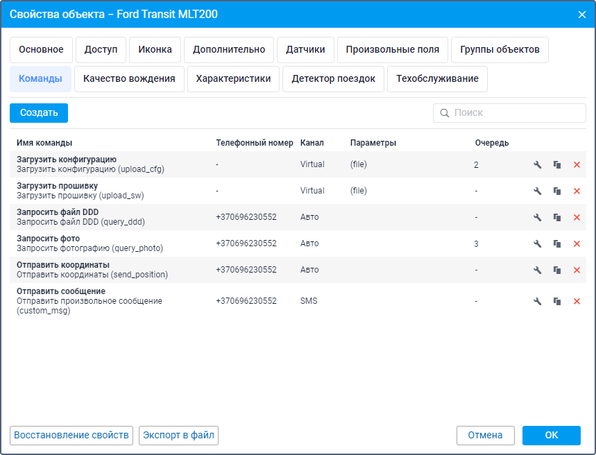 На вкладке Команды можно создавать и настраивать команды для последующей отправки на объект.