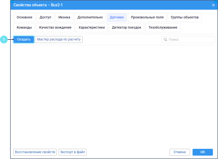 На вкладке Датчики в свойствах объекта нажмите на Создать (