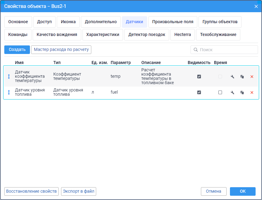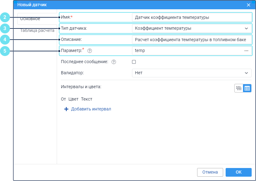 Любая жидкость может сжиматься или расширяться при разной температуре, поэтому показания датчика уровня топлива могут быть недостаточно точными без учета температуры в топливном баке или, например, в цистерне. В таком случае, для получения более точных вычислений уровня топлива необходимо также создать датчик типа Коэффициент температуры. Он позволяет рассчитать коэффициент температуры на основе параметра, в котором приходят данные о температуре или напряжении.