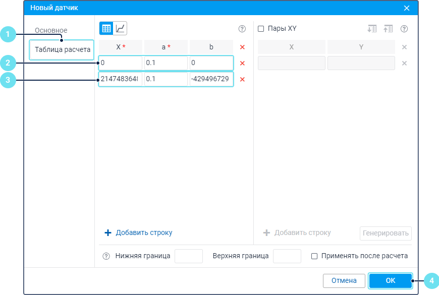 Откройте вкладку Таблица расчета в свойствах датчика.