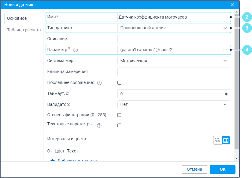 Укажите параметр датчика в виде выражения (param1+#param1)/const2, где param1 — параметр, присылающий значение оборотов двигателя. Параметр датчика коэффициента представляет собой среднее арифметическое оборотов двигателя за интервал между двумя соседними сообщениями.