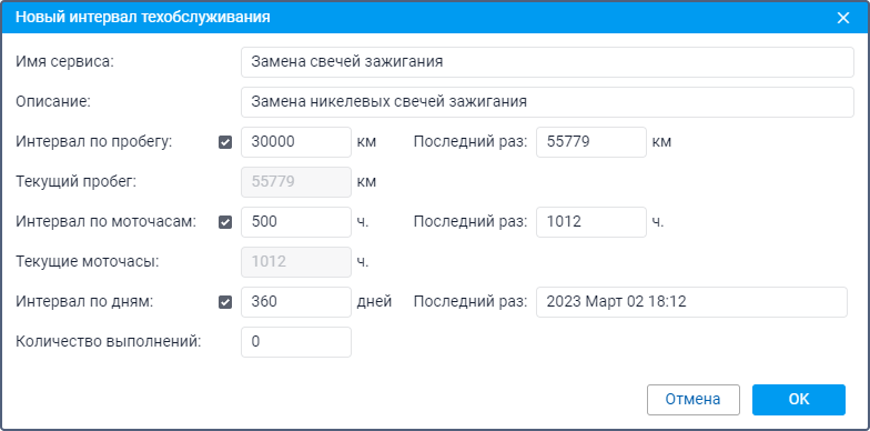 При указании всех интервалов одновременно срок каждого из них отсчитывается отдельно. Например, срок выполнения сервиса может быть просрочен по пробегу или моточасам, но при этом не просрочен по дням.