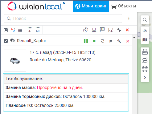 Созданные интервалы техобслуживания и состояние их выполнения могут показываться во всплывающей подсказке к объекту и в расширенной информации об объекте на вкладке Мониторинг.