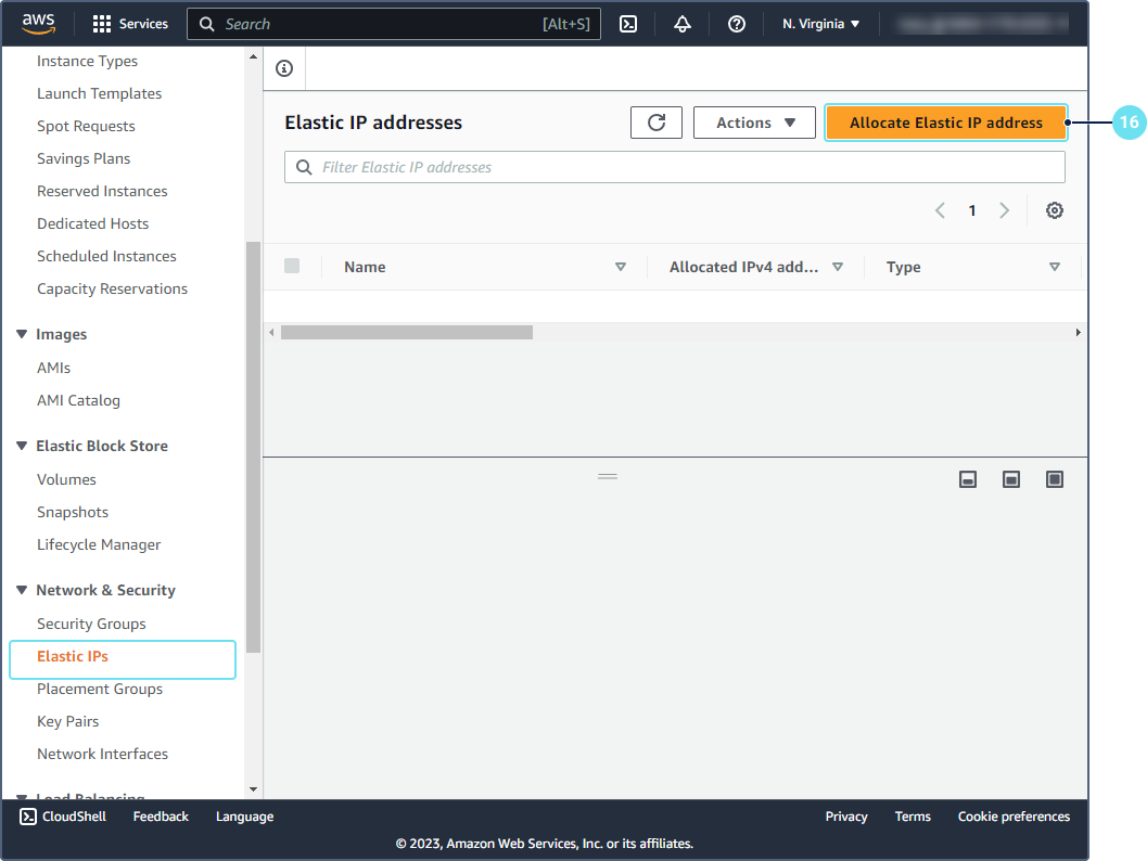 Перейдите на вкладку Elastics IPs и нажмите на кнопку Allocate Elastic IP address.