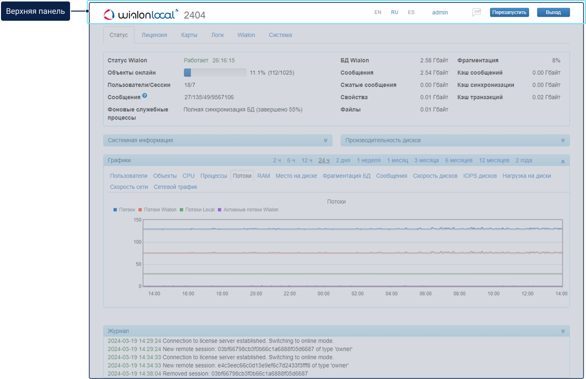 Журнал находится в нижней части экрана. В нем показывается информация о событиях, происходящих в Wialon Local. Например, о его запуске или остановке, наличии доступных обновлений, установке компонентов и т. д. При перезагрузке страницы из журнала удаляются все события.
