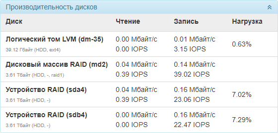В этом блоке представлены данные об интенсивности чтения и записи и о нагрузке на жесткие диски, на которых расположена база данных Wialon Local.