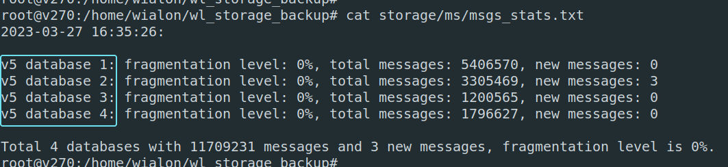 Также готовность конвертации можно проверить по содержанию файла /home/wialon/wlocal/storage/ms/msgs_stats.txt. Все файлы базы данных должны иметь версию V5: