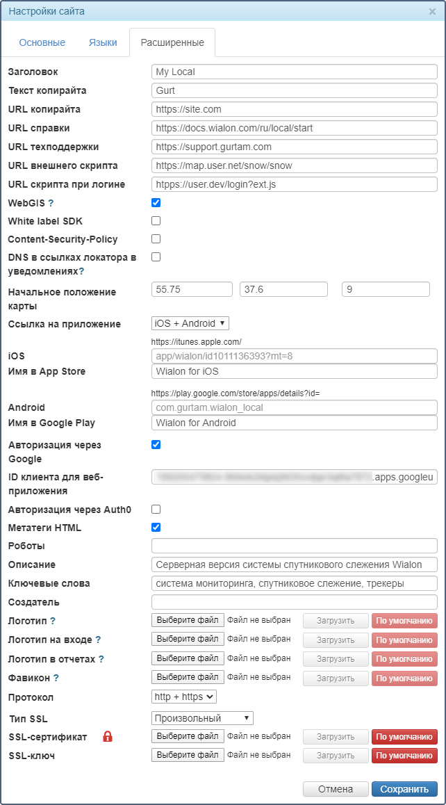 | Протокол | Используемый протокол (http, http+https, https). Для протокола https можно добавить SSL-сертификат и SSL-ключ. Для SSL-сертификата необходимо указать его тип (Произвольный, Let's Encrypt или Самоподписанный). Если выбран тип Let's Encrypt или Самоподписанный, сертификат не нужно загружать самостоятельно: он генерируется автоматически. Для работы сайта Logistics по протоколу https необходимо, чтобы по https также работал сайт (Wialon Web или CMS Manager), указанный в поле Базовый URL-адрес на вкладке Основные (т. е. в поле Протокол для него должно быть выбрано http+https или https). |