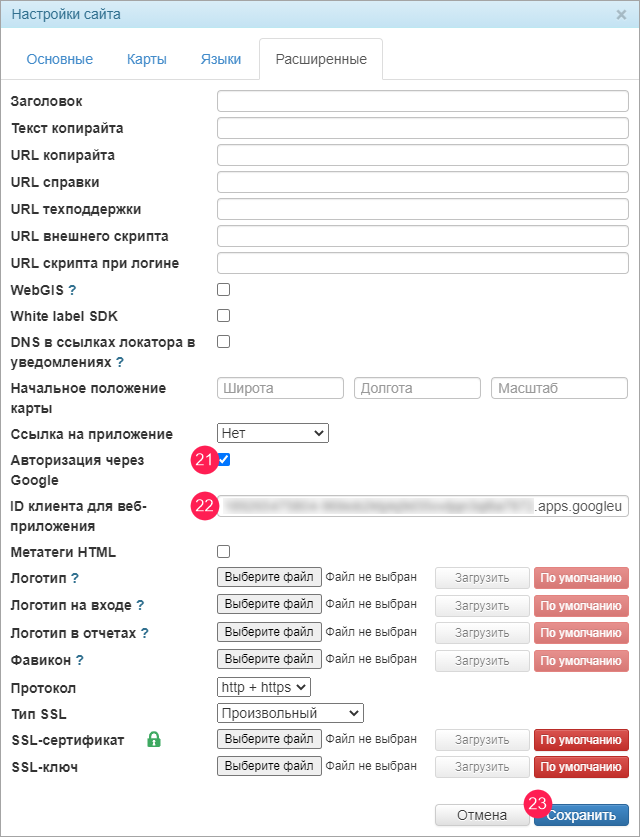 21. В системе администрирования на вкладке Wialon найдите сайт мониторинга (тип Wialon Web), для доступа в который вы хотите использовать авторизацию через Google, и нажмите на кнопку Изменить напротив его имени. На вкладке Расширенные настроек сайта включите опцию Авторизация через Google.