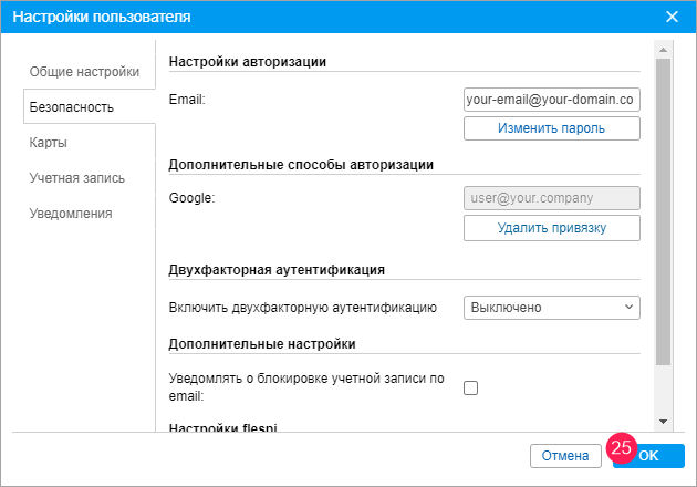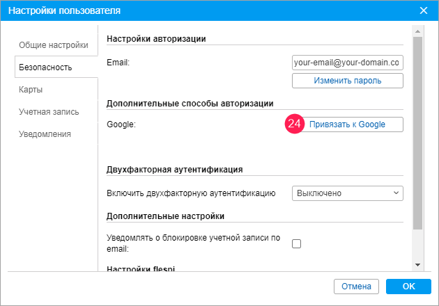 3. Авторизуйтесь на сайте мониторинга от имени пользователя, для которого необходимо настроить авторизацию через Google. В настройках пользователя на вкладке Безопасность нажмите на кнопку Привязать к Google.