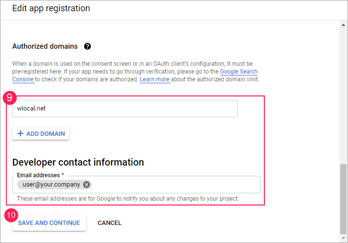 9. Внизу страницы укажите имя домена сайта мониторинга и адрес электронной почты для связи с Google.