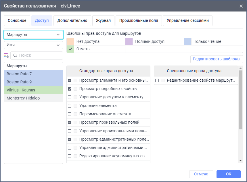 Редактирование неупомянутых свойств | Не влияет на доступ пользователя к маршруту. |