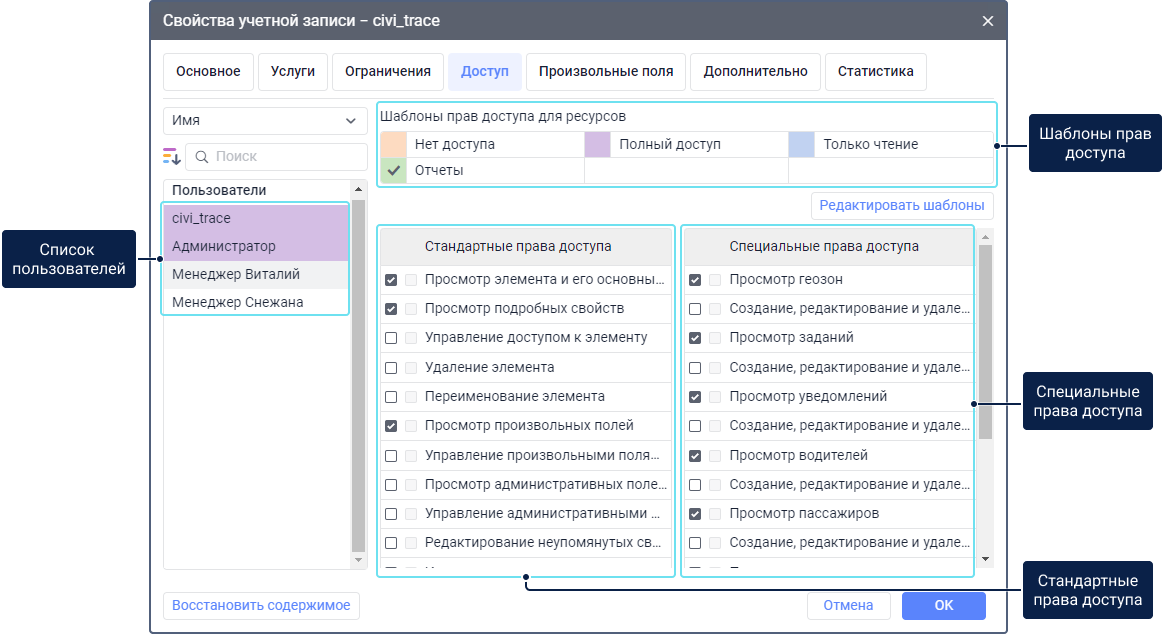 Для работы со вкладкой Доступ необходимо иметь следующие права доступа: