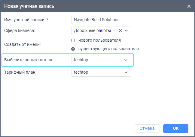 Выберите пользователя | Этот параметр доступен при создании учетной записи от имени существующего пользователя. Здесь необходимо выбрать пользователя, который должен считаться ее создателем. Для выбора доступны только те пользователи, в свойствах которых включена опция Может создавать элементы. Если выбранный пользователь ужé является создателем макроэлементов системы, то поле Тарифный план становится неактивным и учетную запись создать нельзя, так как это может нарушить иерархию. Однако такого пользователя можно указать в качестве создателя ресурса. |