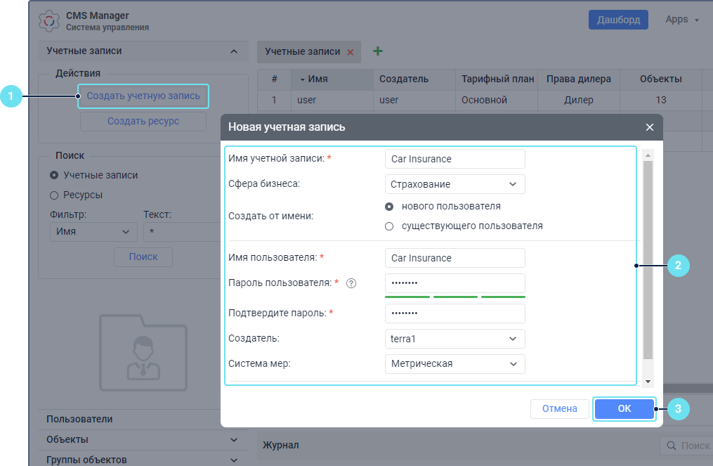 - Нажмите на кнопку Создать учетную запись в разделе Учетные записи системы управления CMS Manager.