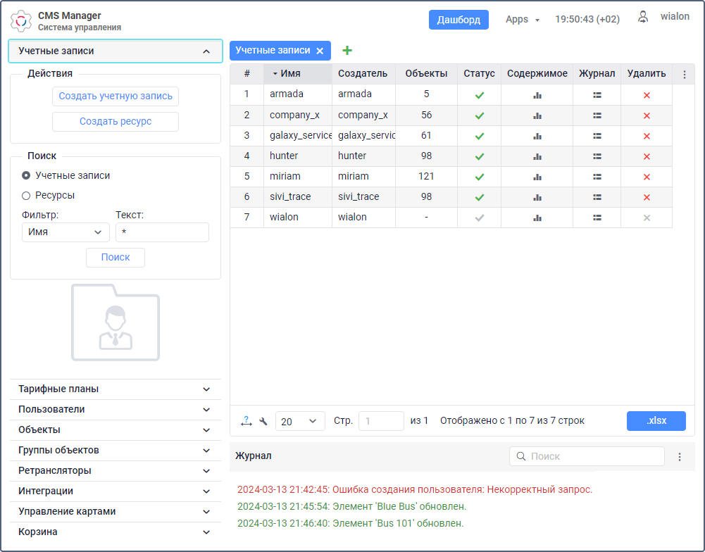 С учетными записями и ресурсами можно работать только в системе управления CMS Manager. Для этого в навигационной панели откройте раздел Учетные записи.