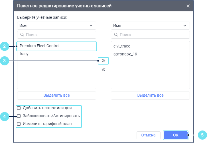 В левом списке выберите учетные записи, свойства которых вы хотите редактировать. Для поиска воспользуйтесь динамическим фильтром. Чтобы искать по имени учетной записи, создателя, родительской учетной записи, тарифного плана, произвольным или административным полям, выберите соответствующую опцию в выпадающем списке над поиском.