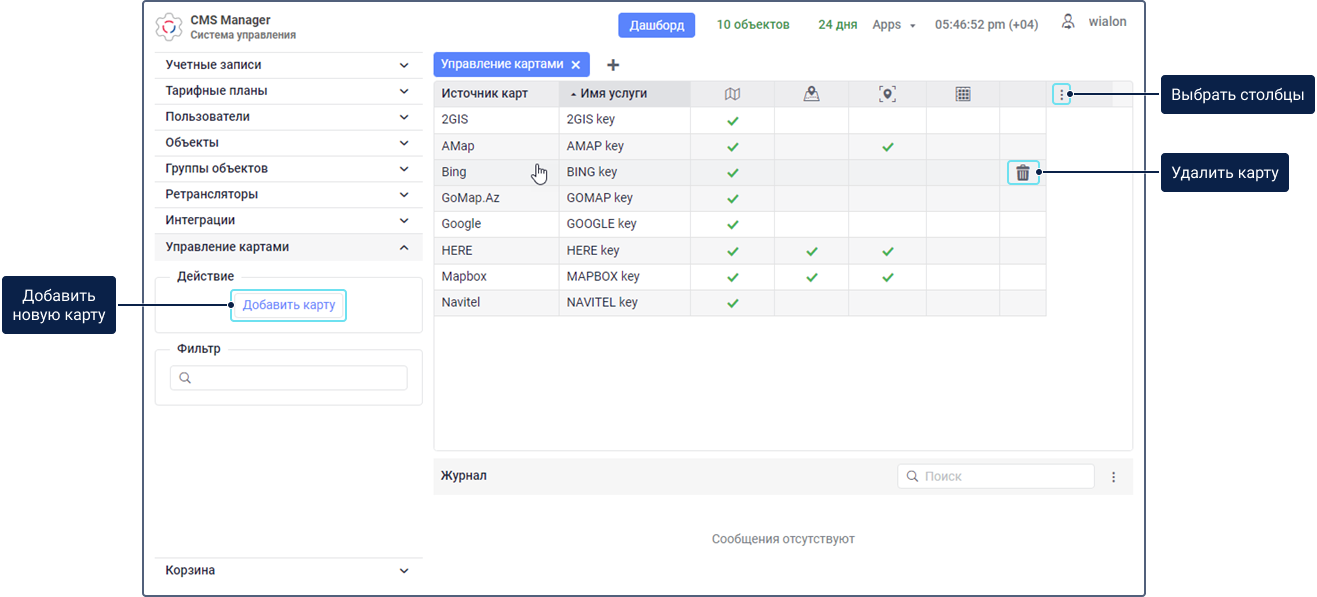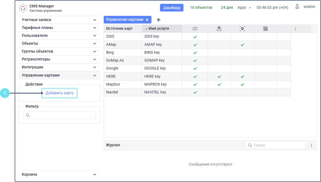 Раздел Управление картами доступен только в системе управления CMS Manager и для учетных записей верхнего уровня. В этом разделе можно добавлять, редактировать и удалять карты. В стандартной таблице представлены все добавленные карты, которые можно использовать в качестве картосновы, источника маршрутизации, источника геоданных и матрицы расстояний. В строке каждой карты отмечены ее доступные сервисы с помощью иконки