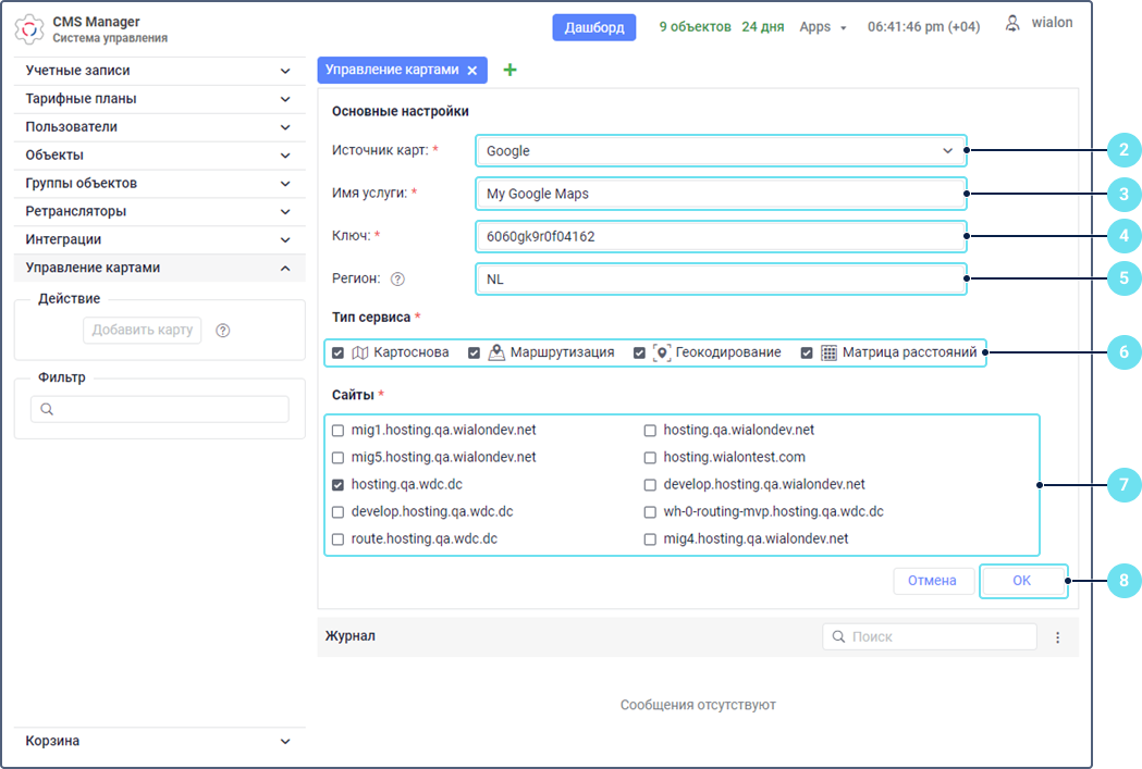 В настройках пользователя системы мониторинга выберите добавленную карту. В зависимости от типов сервисов, выбранных на шаге 6, она может быть доступна в разделах Источник карт, Источник геоданных, Источник маршрутизации.