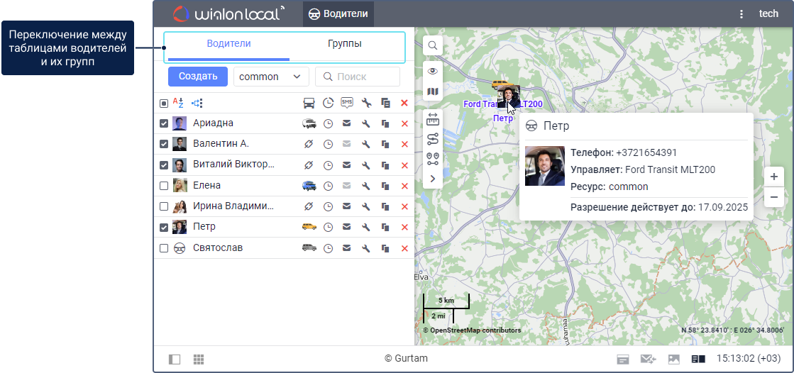 Для работы с водителями щелкните по вкладке Водители в верхней панели или выберите одноименный пункт в окне настройки главного меню. Для работы с группами водителей перейдите в режим Группы.