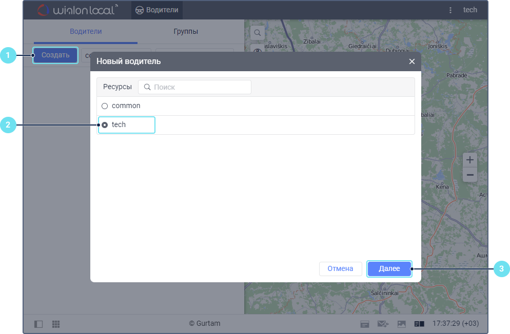 - Выберите ресурс, в котором необходимо создать водителя.