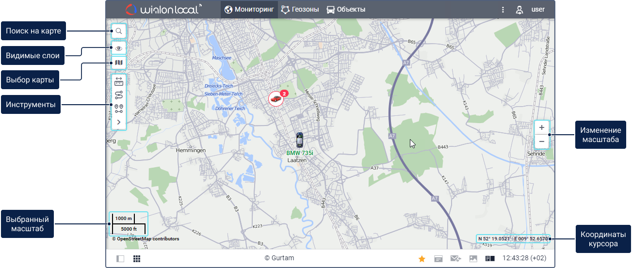 В нижнем левом углу карты указывается текущий масштаб, в котором отображается карта. В правом нижнем углу показываются географические координаты, на которые указывает курсор мыши. Формат отображения координат выбирается в настройках пользователя (градусы либо градусы и минуты).