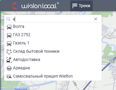 Нажмите на кнопку поиска на карте. В появившемся поле задайте фильтр поиска (введите символы из имени искомого элемента). Кроме того, если речь идет об объекте, то поиск может осуществляться по его уникальному ID, а также по регистрационному знаку или VIN-номеру, введенным на вкладке Характеристики свойств объекта. Во время ввода появляется список элементов, подходящих под ваш запрос. В списке поиска отображаются имена найденных элементов и пиктограммы, указывающие на их тип. Если введенному фильтру соответствует множество результатов, тогда список будет содержать по одному результату для каждого типа элементов.