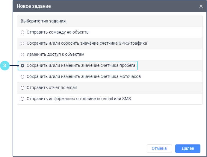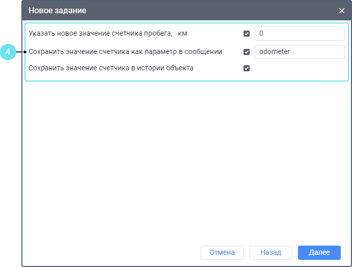 - Установите параметры, которые зависят от выбранного типа задания и описаны в разделе Типы заданий. Для типа Отправить команду на объекты этот шаг выполняется после выбора объектов.