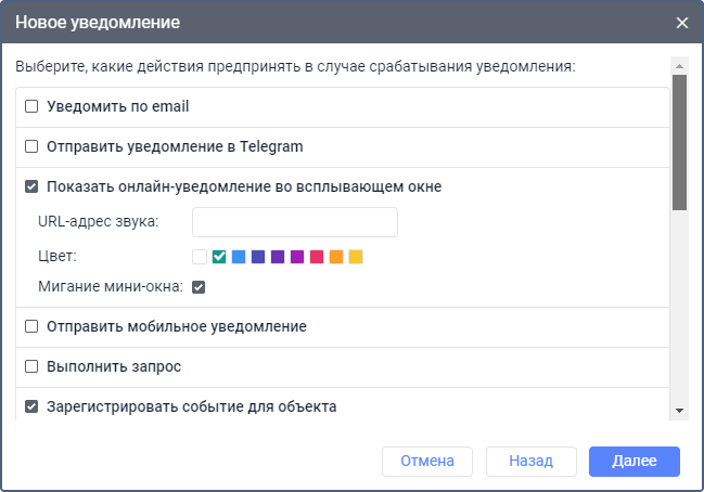 Выберите одно или несколько действий, которые должны выполняться после срабатывания уведомления. Это могут быть отправка уведомления в различных формах, регистрация события или действие с элементами внутри системы.