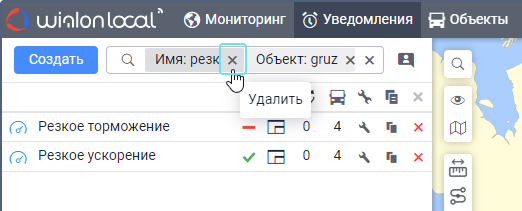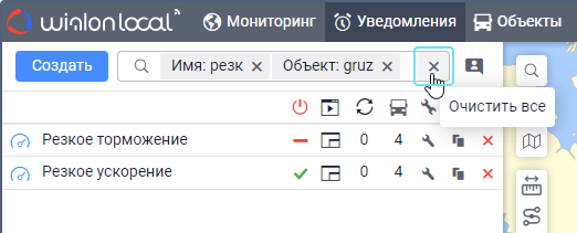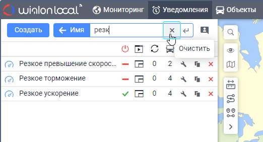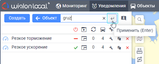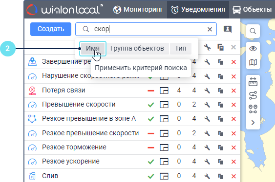 Под полем показываются все критерии поиска, которым соответствует ваш запрос. Например, если вы ввели скор и у вас есть уведомления с именем Превышение скорости, уведомления с типом Скорость и уведомления, созданные для группы объектов Скоростные автомобили, то под вашим запросом покажутся критерии Имя, Тип уведомления, Группа объектов. - Выберите критерий поиска.