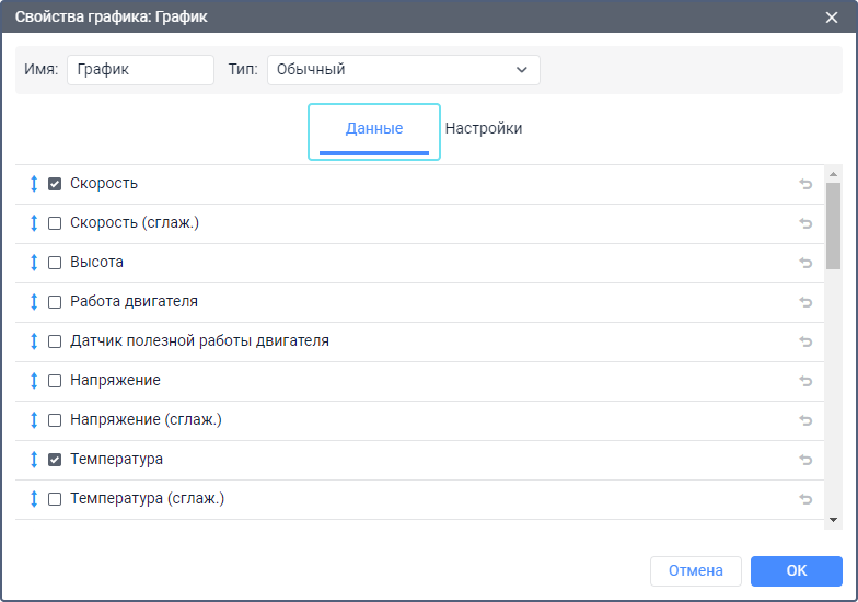 В свойствах графиков доступно две вкладки: Данные и Настройки.