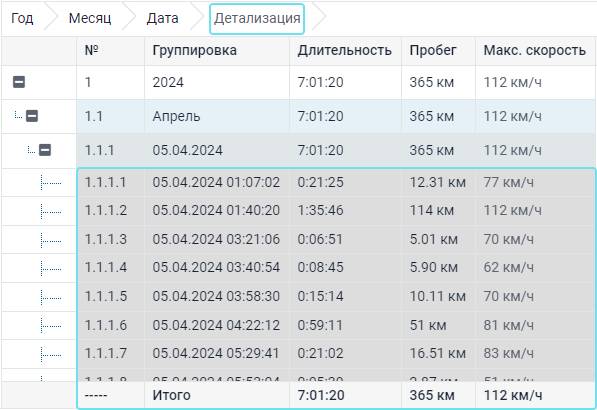 Функция детализации применима только к группируемым таблицам. В иных случаях она не имеет смысла. Исключение составляют отчеты по группам объектов, водителей, прицепов и пассажиров, поскольку в них предусмотрена группировка по объектам по умолчанию.