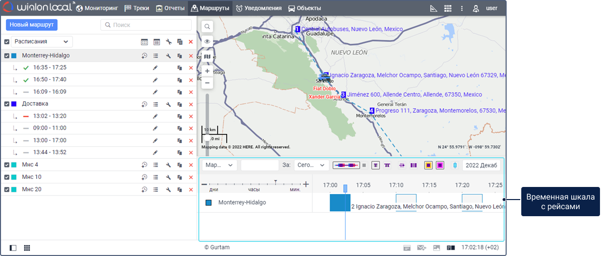 Временная шкала на вкладке Маршруты позволяет отслеживать рейсы в режиме реального времени. На шкале показываются рейсы, которые находятся в процессе выполнения, и все рейсы, созданные вручную.