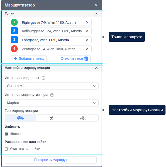 в меню инструментов на карте слева. Чтобы построить маршрут, необходимо выбрать точки маршрута и указать настройки маршрутизации.