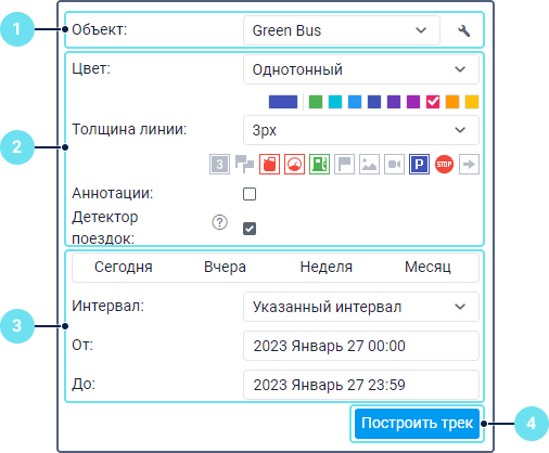 - Укажите временной интервал, за который необходимо построить трек. Принцип выбора временнóго интервала такой же, как в отчетах.