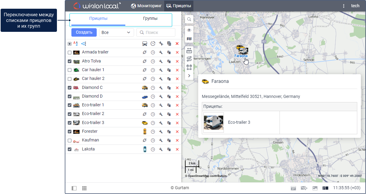 Для работы с прицепами щелкните по вкладке Прицепы в верхней панели или выберите одноименный пункт в окне настройки главного меню. Вы можете работать как с прицепами, так и с их группами.