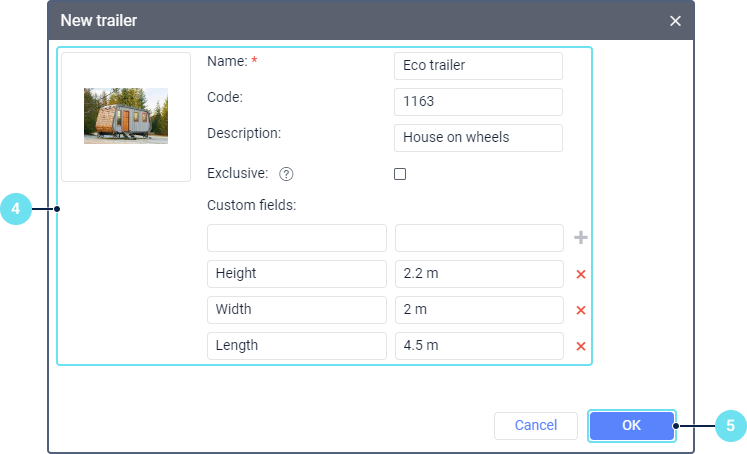 Укажите свойства прицепа: имя, код автоматического назначения, описание. При необходимости включите опцию Исключающий, добавьте произвольные поля и загрузите фотографию в формате PNG, JPG, GIF или SVG. Все свойства прицепа аналогичны одноименным свойствам водителей.