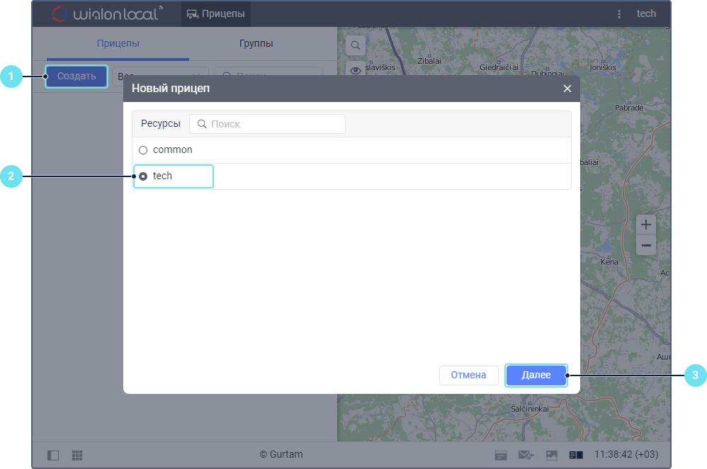 Выберите ресурс, в котором необходимо создать прицеп.