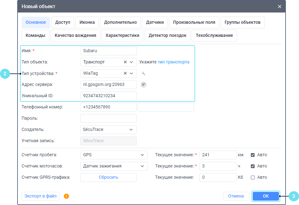 2. Укажите свойства объекта. Для подключения объекта к системе необходимо заполнить как минимум следующие поля на вкладке Основное: