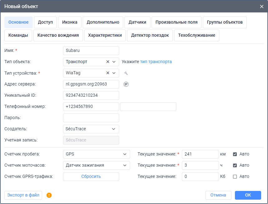 Окно свойств объекта показывается при создании, редактировании и копировании объекта. В окне вы можете указать различные параметры объекта, настроить доступ к нему, создать датчики и пр.