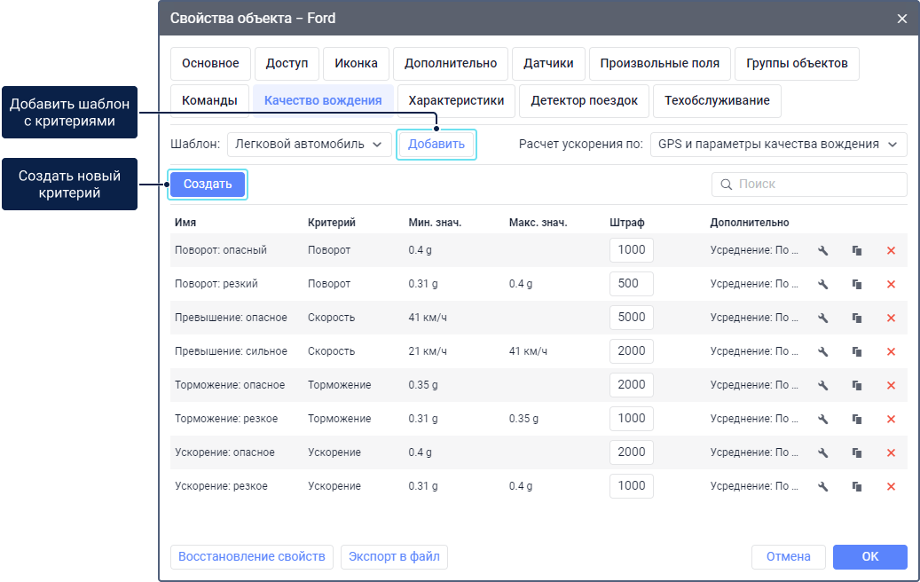 Вы можете добавить критерии качества вождения, применив шаблон, или создать их вручную.