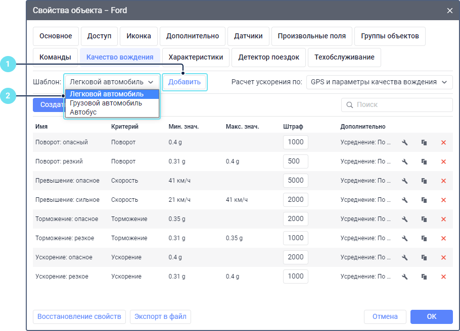 На этой вкладке можно выбрать метод расчета ускорения и добавить критерии, которые позволяют оценить качество вождения водителя и определить нарушения. Это необходимо для того, чтобы повысить безопасность вождения, обеспечить сохранность перевозимого груза и уменьшить расходы на топливо. См. подробнее в статье Контроль качества вождения.