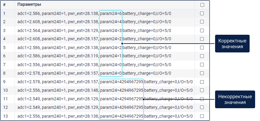 Рассмотрим параметр температуры param24 на изображении ниже. Видно, что при снижении температуры и пересечении порога в 0 градусов показываются некорректные значения.