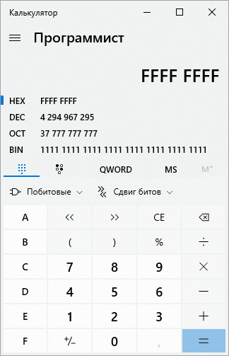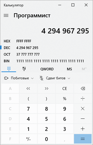 Перейдите в режим шестнадцатеричных чисел (HEX) и посчитайте количество разрядов в полученном числе. Если количество разрядов не равно 2, 4 или 8, то округлите его в бóльшую сторону (например, 5 нужно округлять до 8). В приведенном примере получается 8 разрядов.