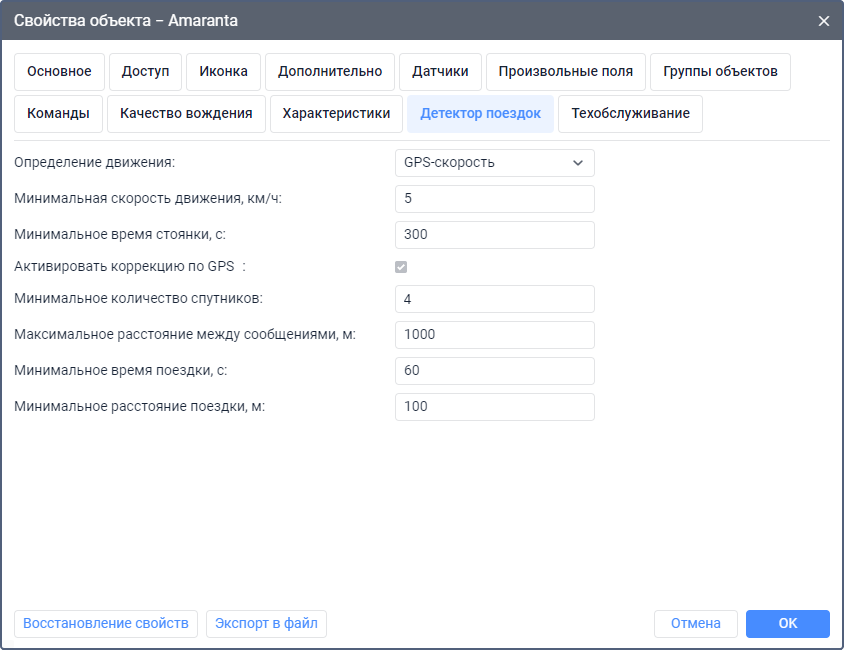 Параметры детектора поездок используются для определения интервалов движения, поездок, остановок и стоянок.