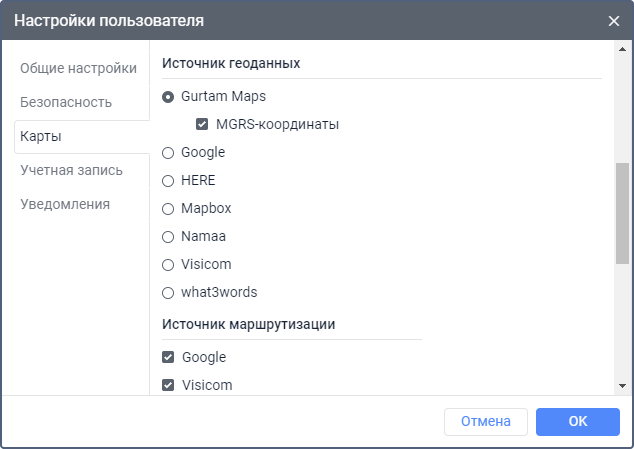 Для источника геоданных Gurtam Maps можно дополнительно активировать опцию MGRS-координаты, если у пользователя подключена услуга MGRS.