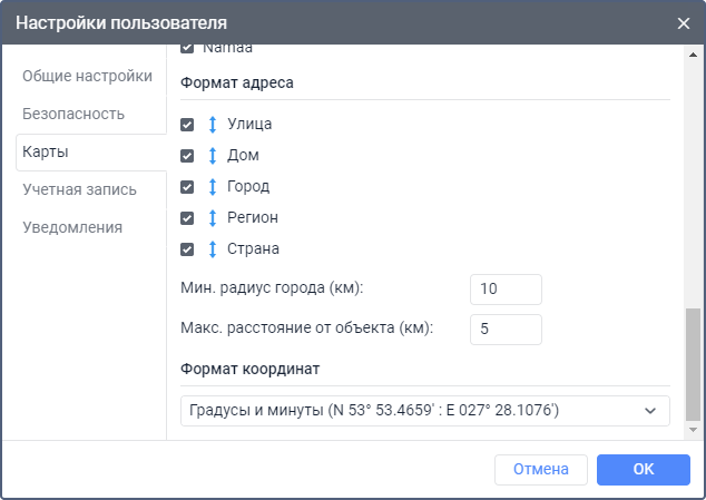 В этом разделе можно настроить формат, в котором должна показываться адресная информация во всплывающих подсказках, инструментах, сообщениях и т. д. Доступны следующие элементы адреса: страна, регион, город, улица, дом. Необходимо выбрать как минимум один элемент. Вы также можете настроить порядок элементов с помощью иконки