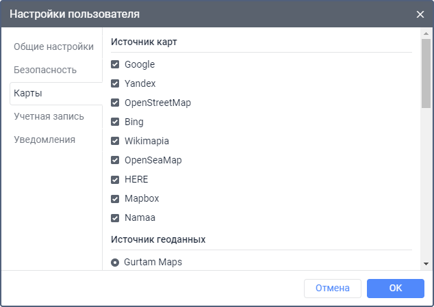 В этом разделе можно включить необходимые источники карт, которые впоследствии можно выбрать в списке картоснов.