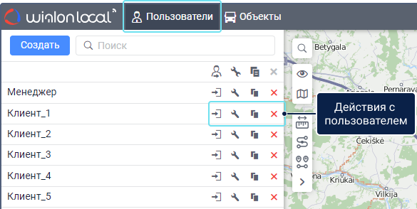 Действия на вкладке «Пользователи»