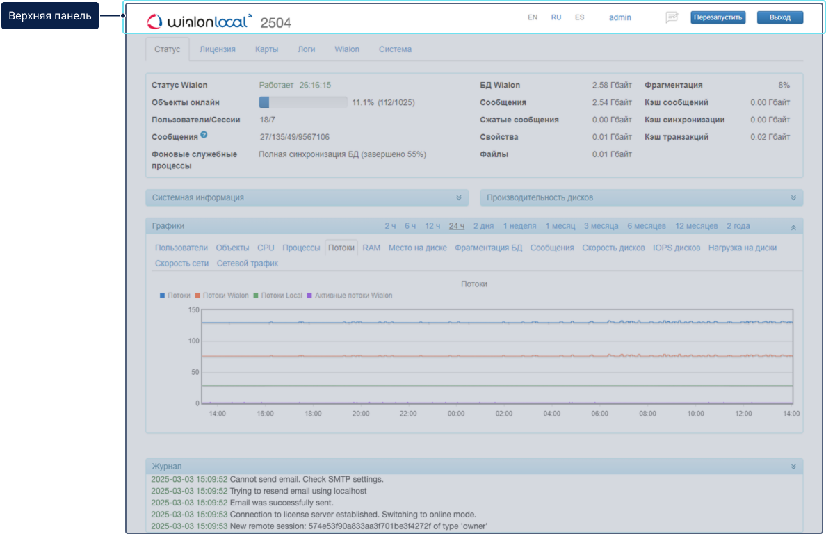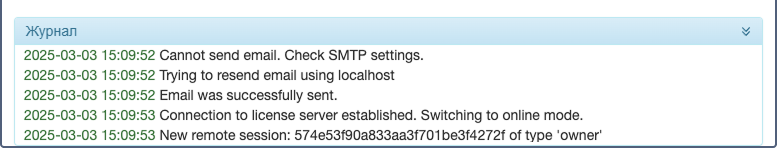 Журнал находится в нижней части экрана. В нем показывается информация о событиях, происходящих в Wialon Local. Например, о его запуске или остановке, наличии доступных обновлений, установке компонентов и т. д. При перезагрузке страницы из журнала удаляются все события.